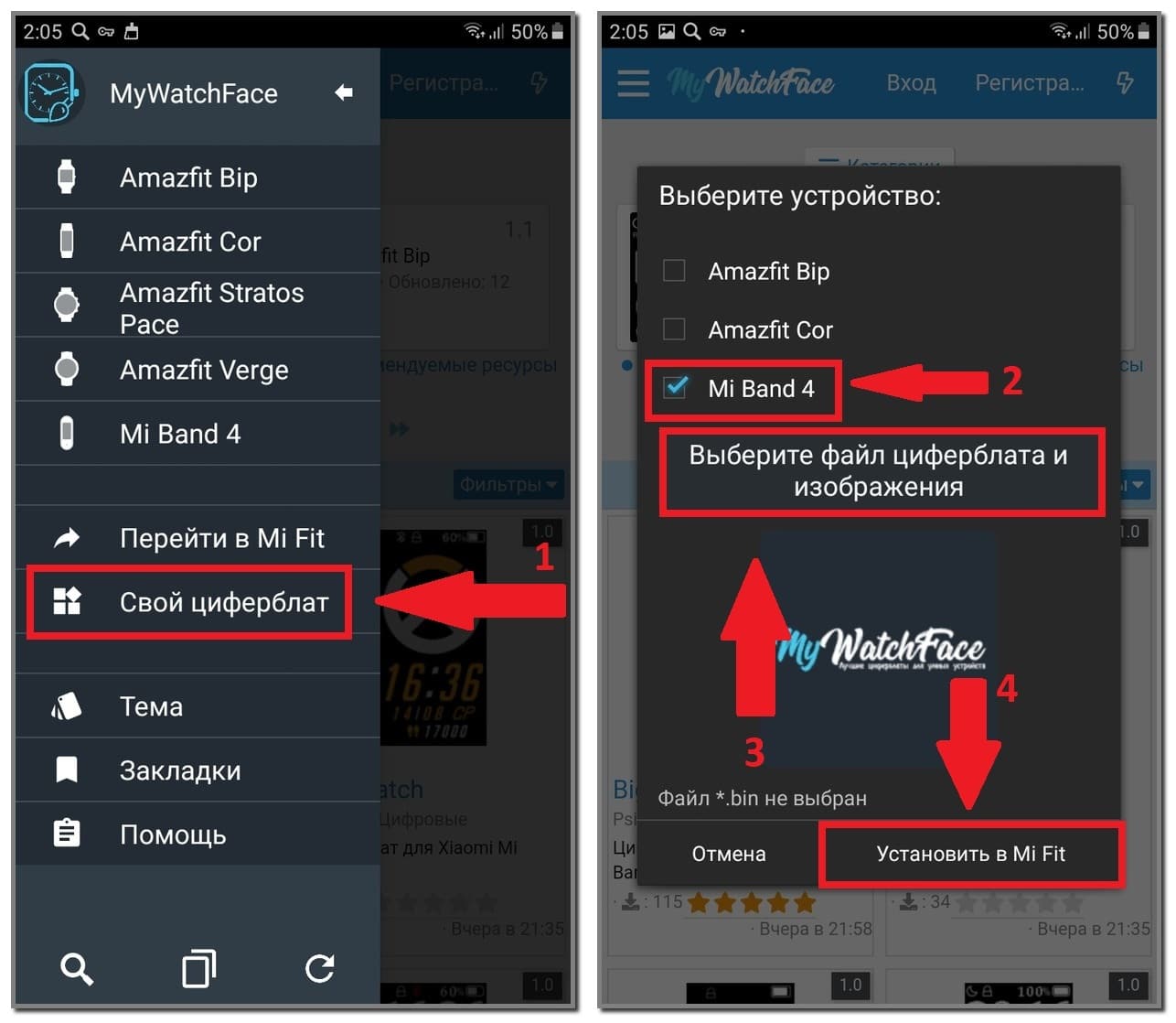 Второй вариант предполагает использование дополнительно программы MyWatchFace. Последовательность действий после скачивания на телефон ее самой, а также файла формата .bin будет следующая: