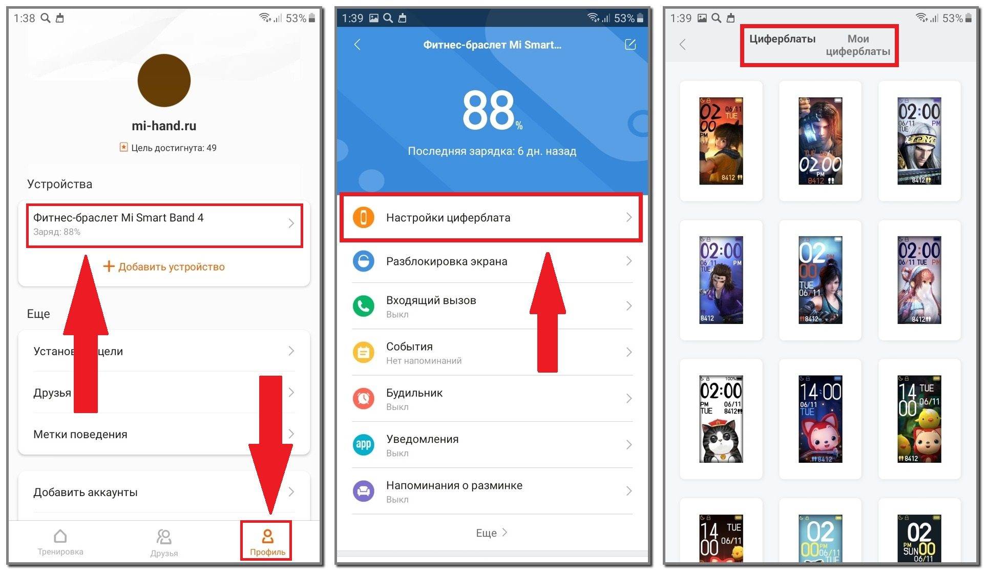 Второй вариант предполагает выбор из более интересных изображений. Для просмотра циферблатов от производителя нужно зайти в приложение Mi Fit, а далее пройти по такому пути: