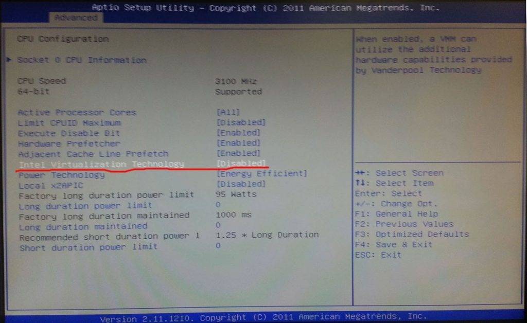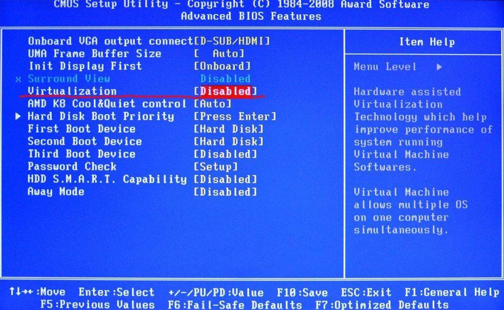 Если этот параметр у вас есть, но эмулятор не запускается должным образом, есть вероятность, что параметр виртуализации отключен в настройках BIOS. Для ее включения заходим в сам BIOS:
