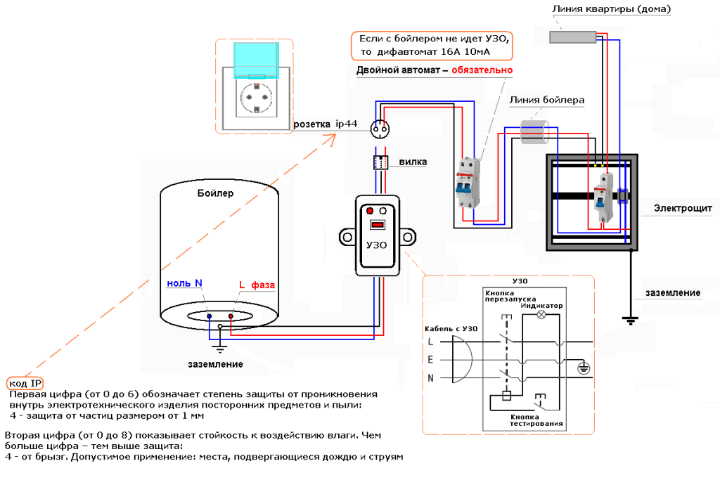 Еще один эффективный способ, позволяющий заземлить бойлер — подключить на линию водонагревателя устройство защитного отключения либо дифференциальный автомат с номиналом 10 либо 30 мА (ток утечки). В этом случае, даже если нет заземления в квартире, при возникновении опасной ситуации удара током удастся избежать, так как сработает УЗО и вся линия будет отключена от сети. О том, как подключить УЗО в квартире мы рассказывали в отдельной статье. Про подключение дифавтомата мы также говорили отдельно.