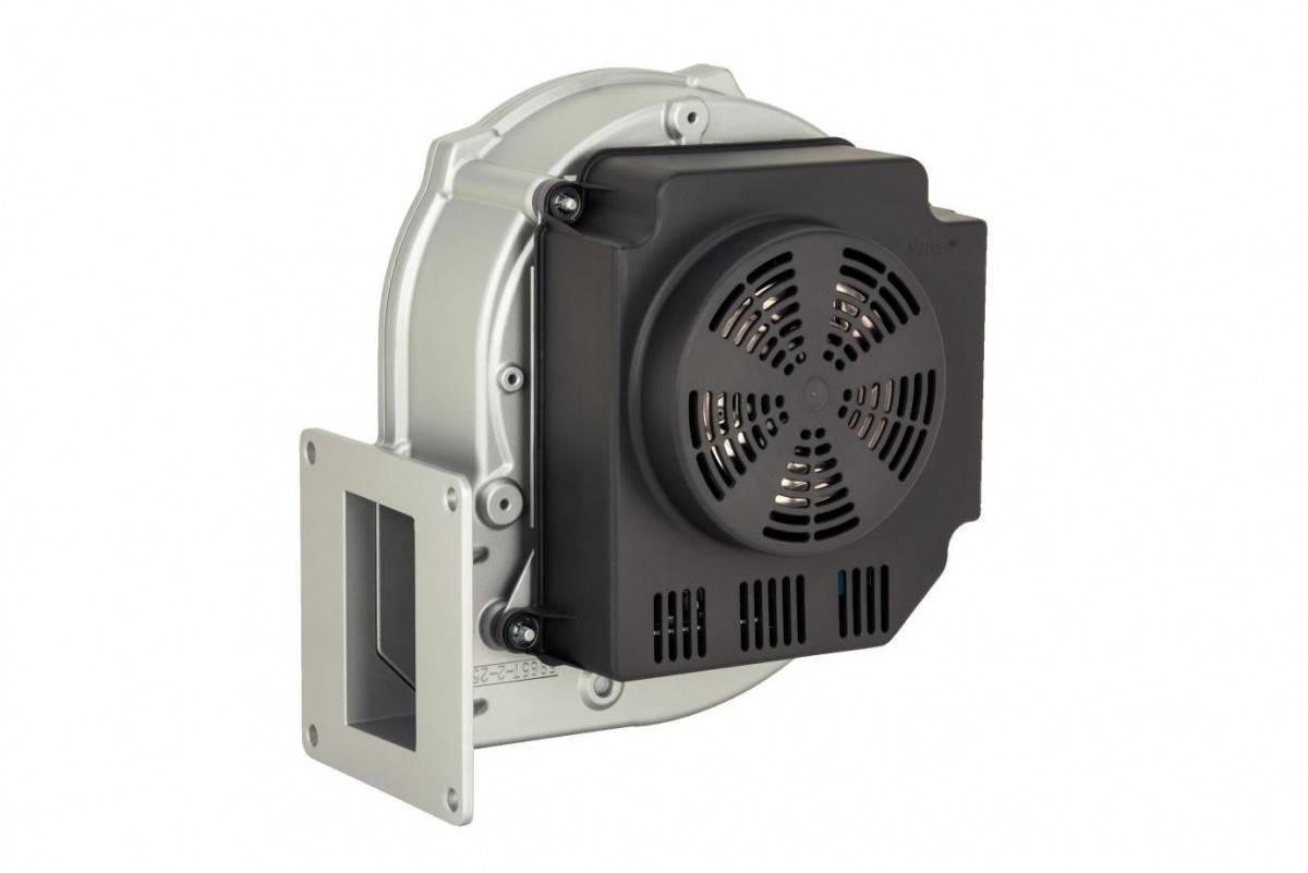 - Центробежные (радиальные) представляют собой спиралевидный корпус («улитку») внутри которого расположена крыльчатка, приводимая в движение электродвигателем. С боковой стороны находится входное отверстие, через которое всасывается воздух. Под прямы углом к входному отверстию расположен выходной патрубок. Исключение составляют крышные радиальные вентиляторы, в которых воздух прокручивается не под прямым, а под развернутым углом, выходя через патрубки, направленные вниз. Входное отверстие в крышных центробежных устройствах также направлено вниз. Агрегаты данной конструкции обладает большей, по сравнению с осевыми вентиляторами мощностью. В них происходит сжатие воздуха внутри нагнетательной камеры и выпуск его с большим, относительно входного, давлением. Такая конструкция и обеспечивает необходимую мощность. Поэтому они пригодны для установки в воздуховодах большой длины.