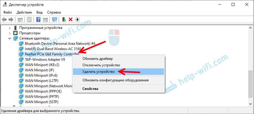 Удалить Realtek PCIe GBE Family Controller можно в диспетчере устройств. Нужно нажать на него правой кнопкой мыши и выбрать “Удалить устройство”.