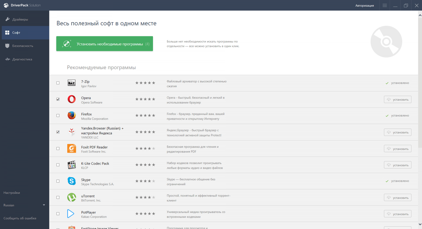 Откройте вкладку «Софт» и уберите галки напротив ненужных приложений. Если этого не сделать, то вместе с драйверами DriverPack Online установит «Яндекс.Браузер», Opera и другие программы, которые вам, возможно, не нужны.
