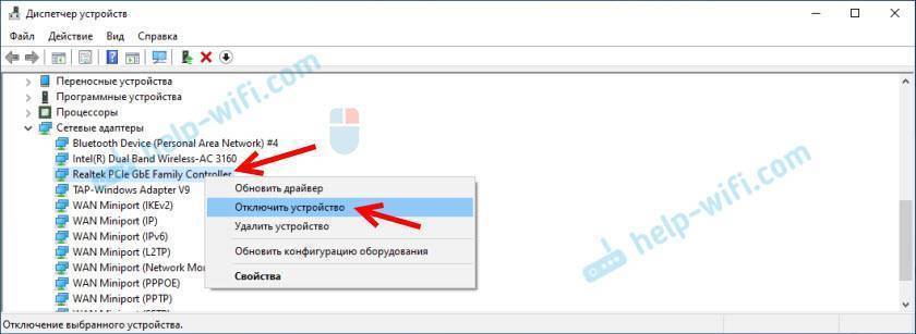 Отключить Realtek PCIe GBE Family Controller можно в том же диспетчере устройств. Просто нажимаем на него правой кнопкой мыши и выбираем “Отключить устройство”.