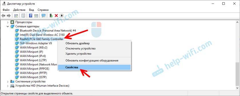 В диспетчере устройств нажимаем правой кнопкой мыши на сетевую карту и открываем “Свойства”.