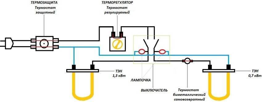 Электрический нагреватель оснащается устройством защитного отключения, которое представляет собой небольшой блок с кнопками и индикаторами. Он предотвращает поломку оборудования в случае перепадов напряжения.