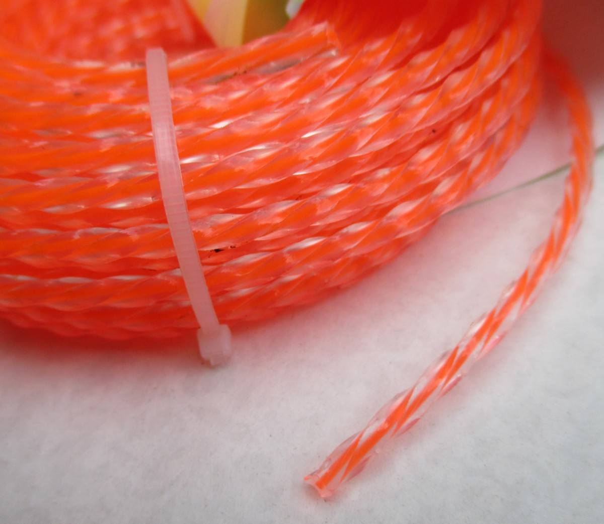 Скрученная, или витая, леска мало шумит и лучше справляется с сухой травой и бурьяном. Но изнашивается быстрее прямой. Причем ломается при столкновении с камнями и препятствиями. Иногда при разматывании цепляется за катушку.