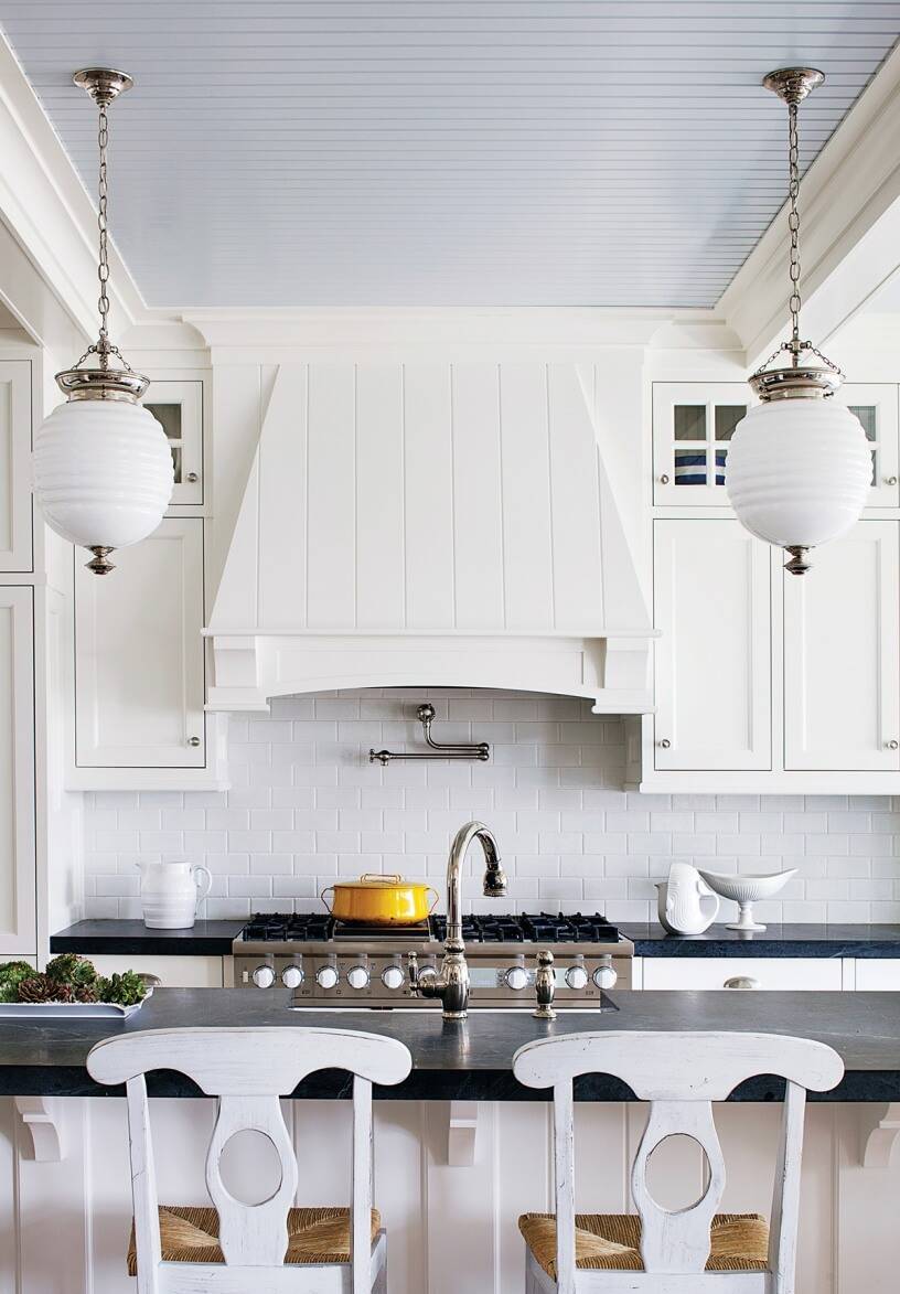 Освещения на кухне должно быть достаточно, это обычно основной свет и свет на рабочей зоне (используют точечные светильники). Если есть вытяжка, то нет необходимости монтировать светильники над плитой, так как лампы, которая есть в вытяжке достаточно для освещения зоны. Плюс к этому освещение без вытяжки будет быстро загрязняться, что усложняет уход за кухней.