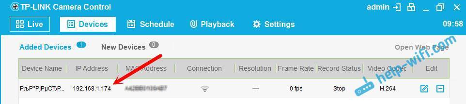 Обратите внимание, что на вкладке Devices, отображается IP-адрес камеры, который, возможно понадобится для входа в настройки IP-камеры