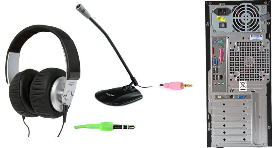 Если у вас есть динамики или наушники, вы можете подключить их к компьютеру в аудио порт (на передней или задней панели системного блока). Эти порты имеют разные цвета, как и штекеры для подключения. Колонки или наушники подключитесь к зелёному порту, микрофон подключается к розовому (красному) порту. По цвету штекера не ошибётесь. Синий порт использоваться с другими типами устройств.
