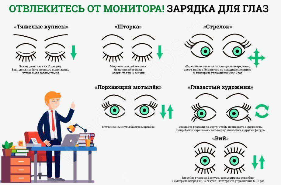 Чтоб не терять зрение за компьютером, выполняйте указанные ниже упражнения хотя бы 3-4 раза в день. Кратко рассмотрим особенности: