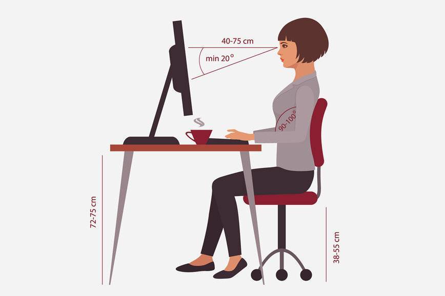 Рабочее место должно быть удобным и не вредить вашему здоровью. Когда работаете за компьютером, вам нужно сидеть на расстоянии вытянутой руки от него. Экран настройте так, чтобы он был слегка наклонён вниз. Оптимально — на 15–20 градусов ниже глаз. Работать, немного опустив голову, комфортно: так мышцы шеи не сильно напрягаются.
