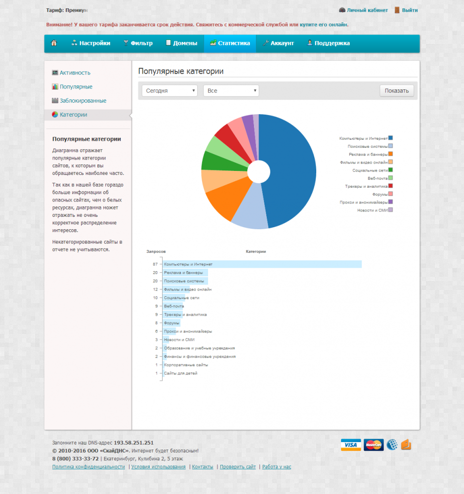 После регистрация вам станет доступна панель управления системы контентной фильтрации. И вы можете приступить к управлению веб-сервисом. Все происходит централизовано, то есть с вашего компьютера.