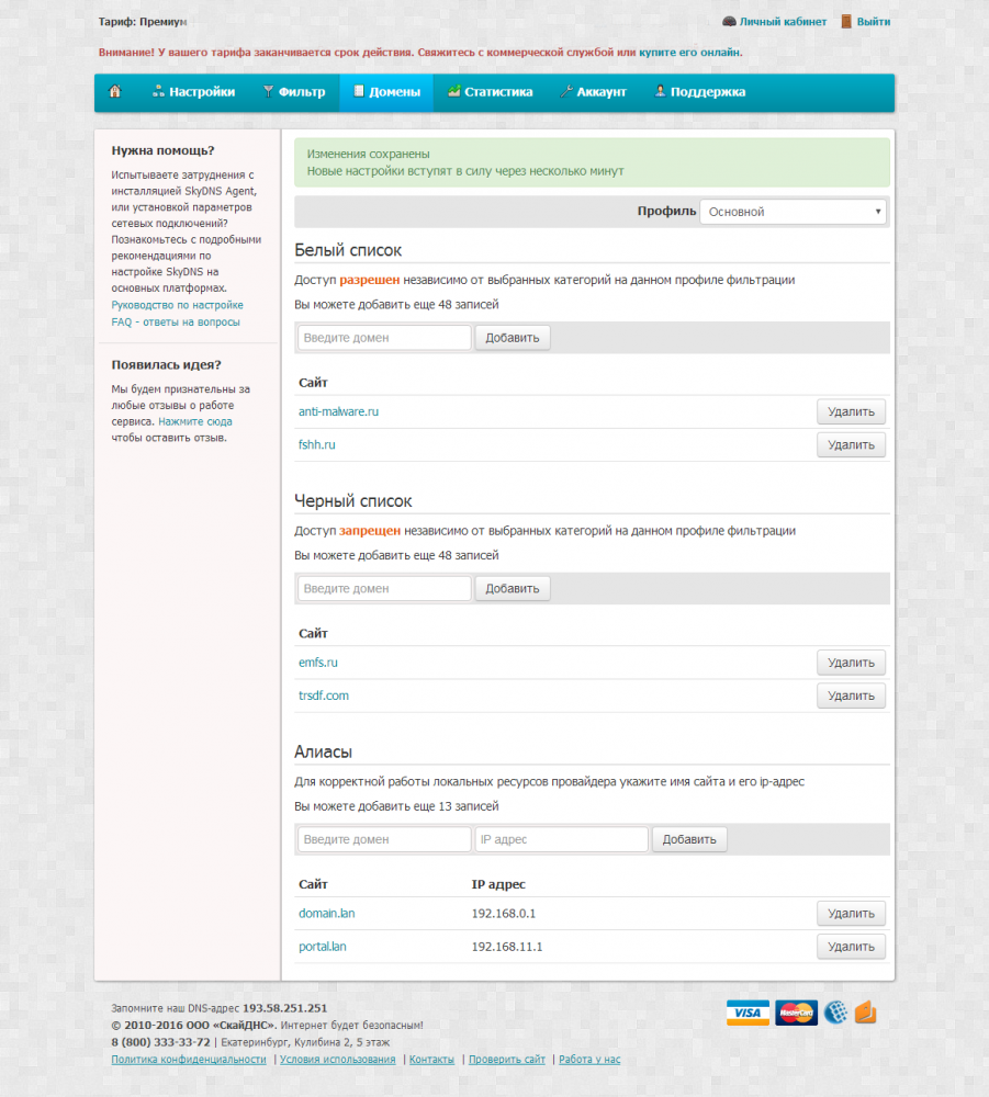 Рисунок 2. Работа с черными и белыми списками в облачном сервисе SkyDNS