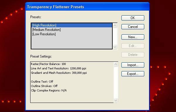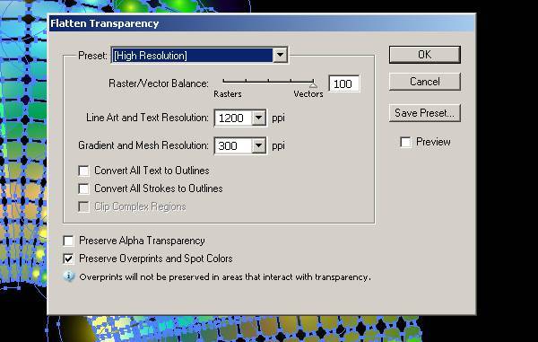Сведение затрагивает как сами объекты с прозрачностями, так и те, на которые они накладываются. То, что находится слоем выше, сведению не подлежит. При использовании художественных кистей, текстур, текста, паттернов ниже прозрачных областей сначала нужно выполнить команду Expand во избежание возможных искажений. Учтите, эта операция увеличивает количество узлов, что влияет на вес файла не в лучшую сторону. Далее выполняем команду Flatten Transparency. Внимательно смотрите настройки, Raster\Vector Balance должен находиться в крайнем правом положении.