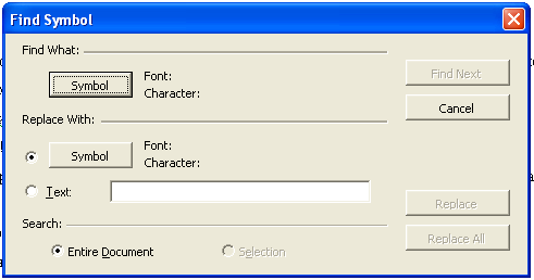Для желающих в архиве есть страничка с подробным объяснением (FindReplaceSymbols.zip), и набор полезных макросов (Macros9.zip). Возвращаясь к задаче замены буллитов на дефисы, её теперь можно решить макросом Find Symbol из этого набора: