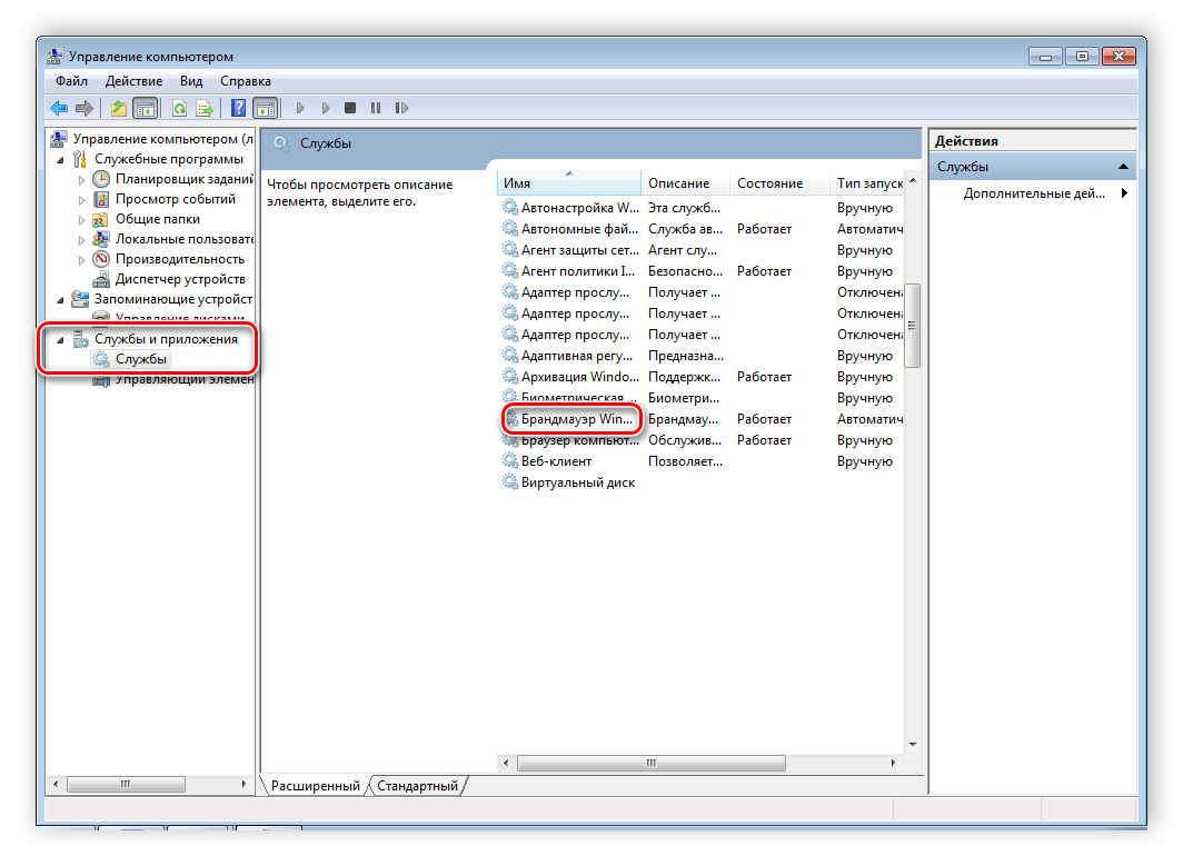 В разделе «Службы и приложения» необходимо перейти к параметру «Брандмауэр Windows».