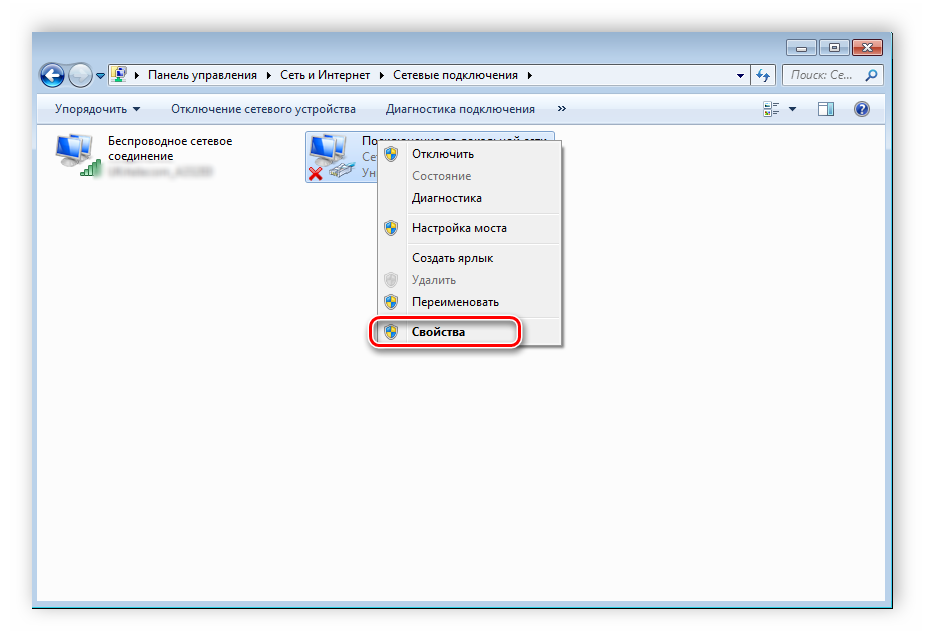 В данном окне выберите беспроводное или соединение по LAN, в зависимости от выбранного вами способа, нажмите правой кнопкой мыши на его значок и перейдите в «Свойства».