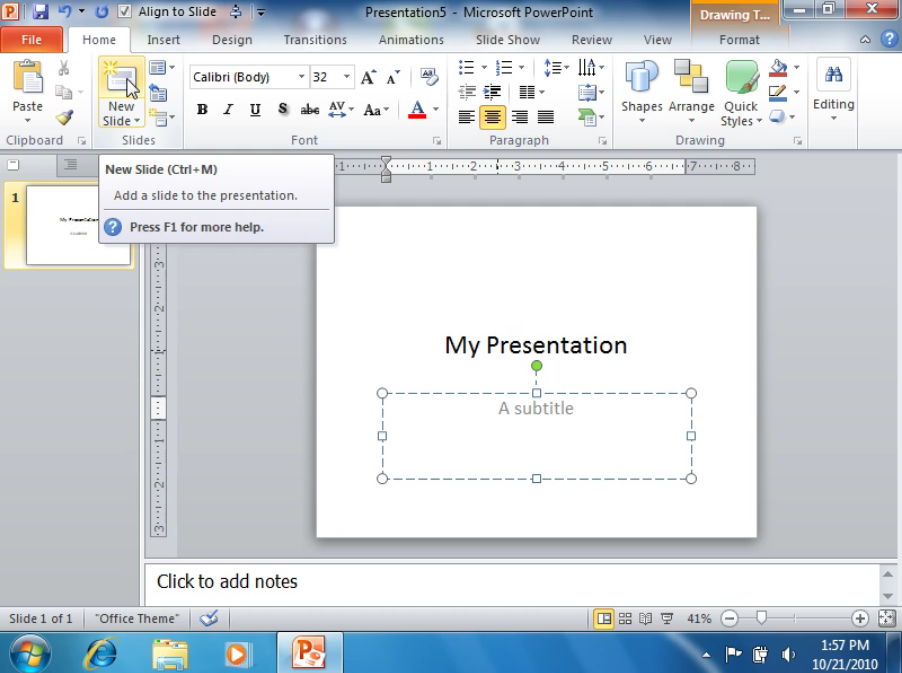 - На экране уже открыт первый слайд – введите заголовок и текст, выровняйте текст, поработайте со шрифтами и размером символов, попробуйте создать нумерованный или маркированный список через меню Формат.