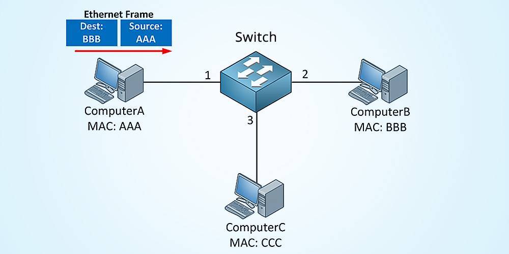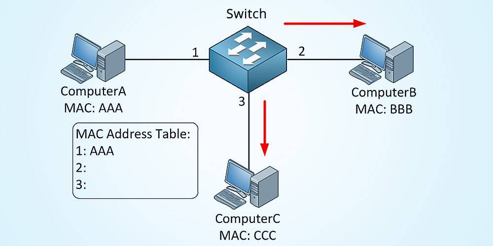 Компьютер A будет отправлять некоторые данные, предназначенные для компьютера B, поэтому он создаст канал Ethernet, который имеет MAC адрес источника (AAA) и MAC адрес назначения (BBB). Коммутатор имеет таблицу MAC адресов, и вот что произойдет: