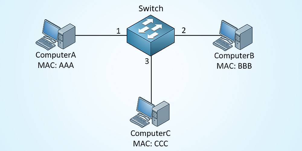 Посередине есть коммутатор, а вокруг 3 компьютера. У всех компьютеров есть МАС адрес, но они упрощены как АА, ВВВ и ССС. Коммутатор имеет таблицу МАС-адрсов и узнает, где находятся все МАС адреса в сети. Теперь, предположим, что компьютер А собирается отправить что-то на компьютер В: