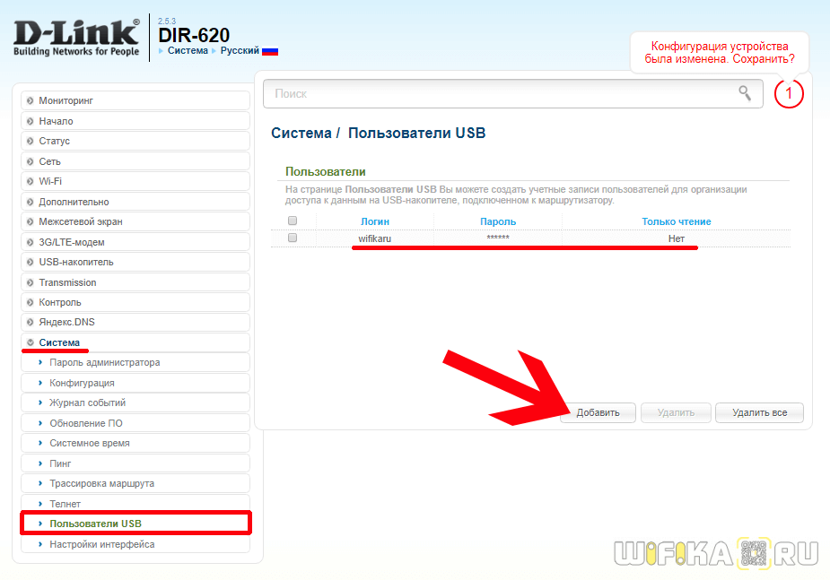 Для создания пользователя переходим в раздел «Система — Пользователи USB». Здесь жмем на кнопку «Добавить»