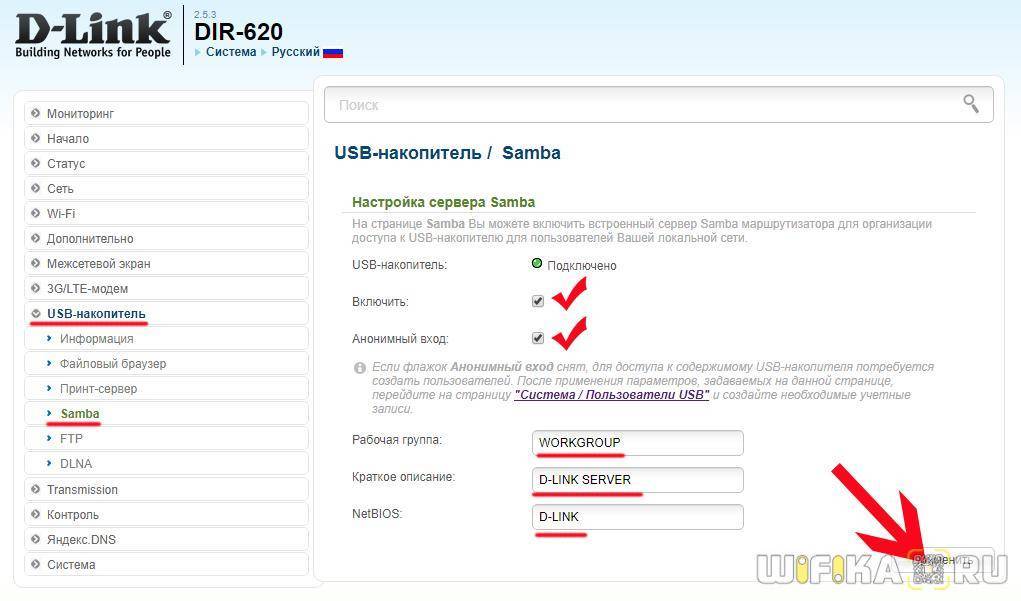 После этого можно пройти в раздел «USB накопитель — Samba». Здесь активируем сервер галочкой «Включить» и при желании даем возможность анонимного подключения к нему.