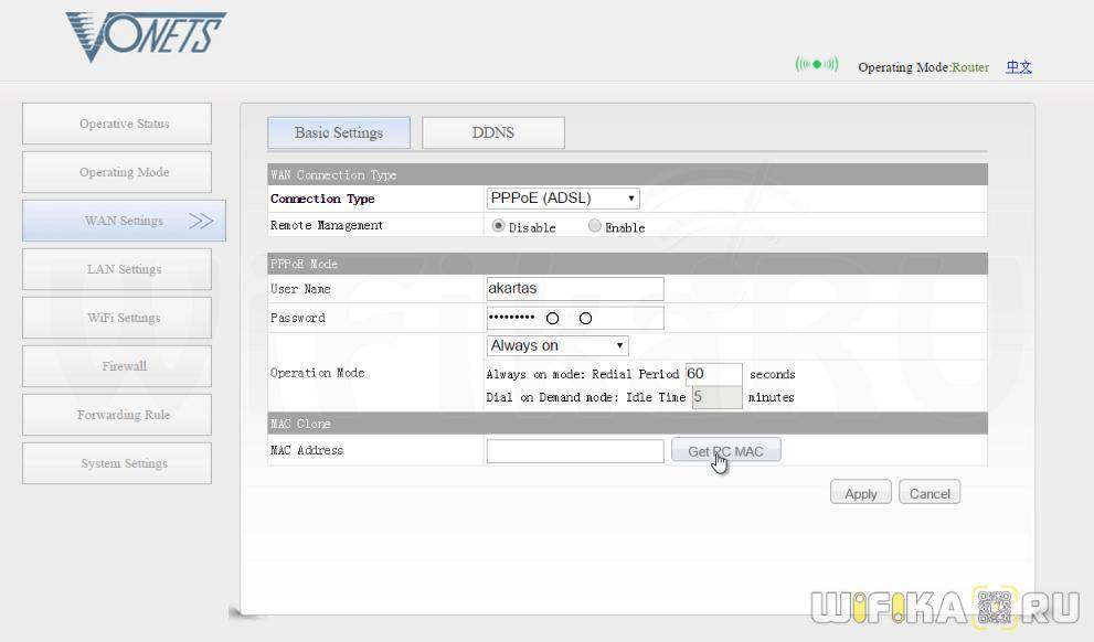 Настройки подключения к интернету производятся в разделе «WAN Settings». Выбираем тип подключения, вводим данные для авторизации. Здесь же есть функция клонирования MAC адреса с компьютера.