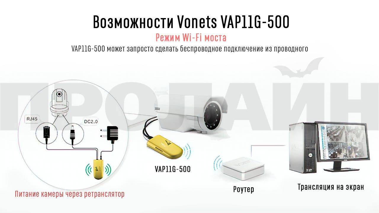В режиме ретранслятора увеличивает дистанцию передачи видео с Wi-Fi камер до роутера до 100 метров, а в паре с такимже VAP11G-500 в режиме Wi-Fi моста (точки доступа) может передавать видео с IP-камер до коммутатора или NVR до 500 метров. Благодаря своей мощности VAP11G-500 стабильно работает, в случаях реализации видеонаблюдения в кабине лифта.