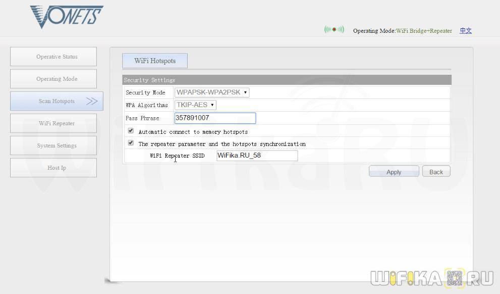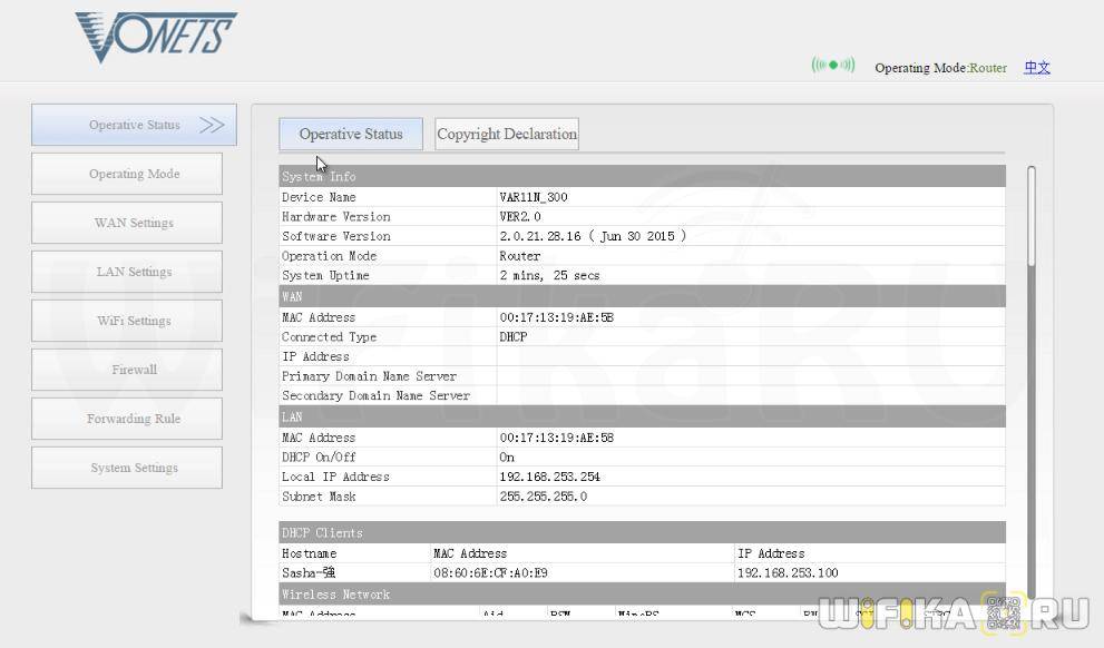 В этом режиме Vonets будет принимать сигнал по Wifi и дальше раздавать его одновременно по встроенному кабелю и так же беспроводным способом. Для переключения также нужно будет выбрать его в разделе «Operating Mode» и вручную перезапустить девайс.