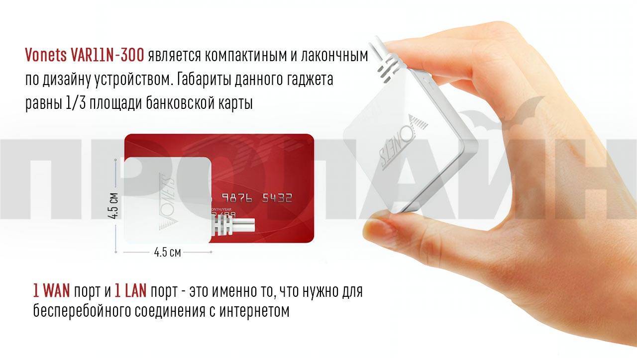 Технологии регулирования частоты (DFC) и компенсации температуры (TAFC) гарантируют максимальную стабильность работы во время подключения. VAR11N-300 абсолютно безопасен в повседневном использовании, поскольку принцип работы отличается от традиционного, в котором обычные роутеры работают с излишним излучением, а это может нанести вред здоровью пользователя. Чтобы увеличить зону покрытия сетью Wi-Fi, необходимо разместить маршрутизатор Vonets в зоне его действия – он сработает как усилитель сигнала. Благодаря этому прибору, нет необходимости увеличивать мощность работы основного роутера.