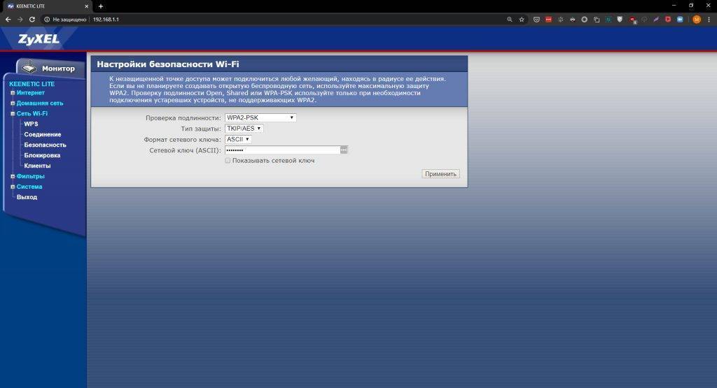 Если не хотите, чтобы соседи использовали ваш интернет, включите защиту паролем. Выберите надёжный стандарт шифрования WPA2‑PSK и введите комбинацию, которую легко запомнить, но сложно угадать.