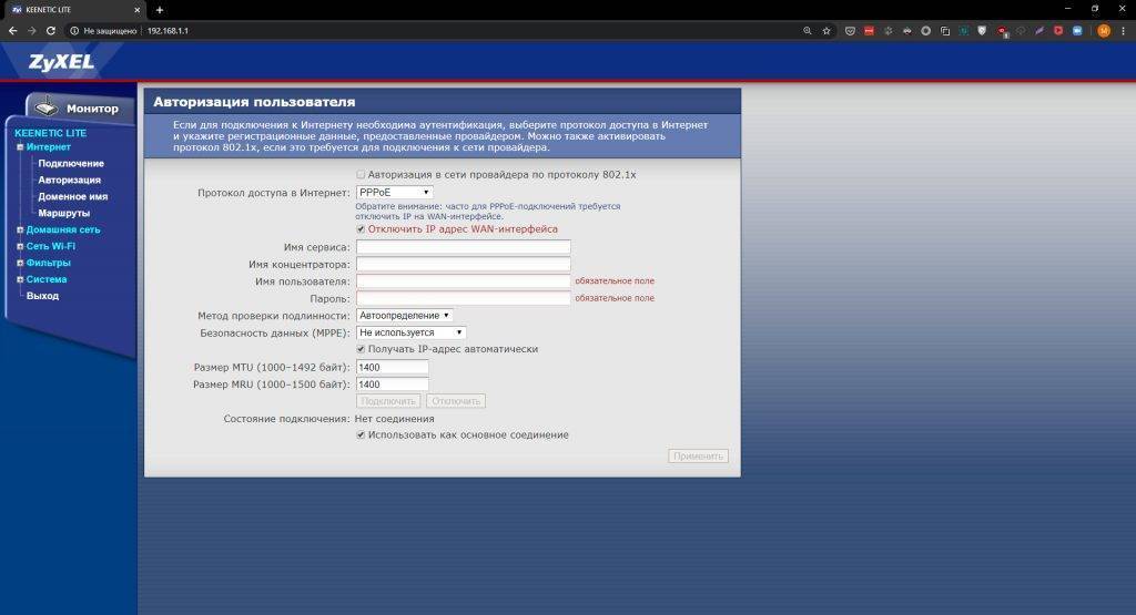 Если интернет пока не работает, придётся настроить подключение вручную. Для этого необходимо зайти в раздел WAN, «Интернет» или с подобным названием — зависит от модели роутера — и указать нужные параметры. Обычно это логин, пароль и сетевой протокол (например, PPPoE или L2TP), которые требует провайдер.
