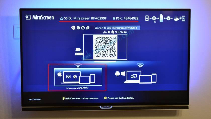 Значит наш адаптер подключен, включен и настроен. Он должен быть подключен к той же Wi-Fi сети, что и наш iPhone, или другое устройство, с которого мы будем делать повтор экрана. Если адаптер не подключен к роутеру, или роутера нет, то нужно наше iOS или Mac OS устройство подключить напрямую к Wi-Fi сети самого адаптера. Имя сети (SSID) и пароль (PSK) указаны на экране телевизора (см. фото ниже).