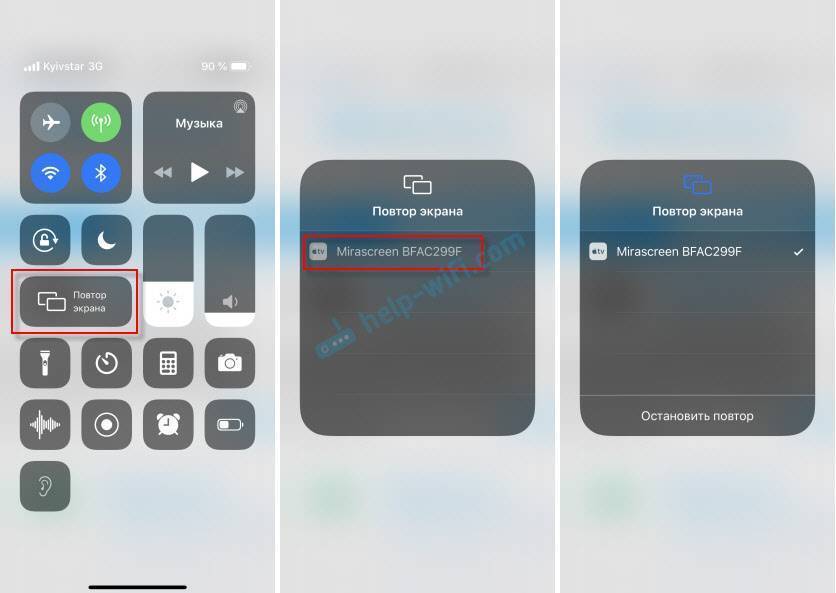 На Айфоне или Айпаде открываем центр управления и выбираем “Повтор экрана”. Если все подключили правильно, то в списке доступных устройств должна отображаться наша MiraScreen приставка. Просто выбираем ее.