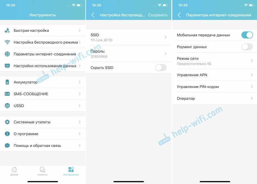 Все основные настройки находятся на вкладке ‘Инструменты’. Первый в списке мастер быстрой настройки. С его помощью можно изменить все основные настройки роутера (пошагово). В разделе ‘Настройка беспроводного режима’ можно сменить имя сети и/или пароль, а так же сделать Wi-Fi сеть скрытой. А в разделе ‘Параметры интернет соединения’ есть возможность отключить мобильную передачу данных, включить передачу данных в роуминге, выбрать режим сети, вручную изменить APN, выполнить необходимые операции с PIN-кодом и выбрать оператора (по умолчанию стоит автоматический выбор). Как я уже писал в начале статьи, TP-Link M7200 автоматически определяет оператора и настраивает подключение к интернету.