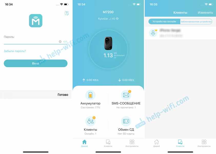 Запустите приложение tpMiFi. Если роутер будет обнаружен, то понадобится ввести пароль администратора роутера. Напомню, что заводской пароль (если вы его не меняли) – admin. На главной странице мы сразу видим информацию об операторе, сети в которой работает роутер, уровню сигнала и использованных данных. Ниже находится информация об аккумуляторе, раздел с SMS-сообщениями, подключенные клиенты и ‘Обмен СД’ (эта модель не поддерживает SD-карты). Так же на нижней панели есть вкладка ‘Клиенты’, где можно посмотреть список подключенных устройств, установить для каждого (нажав на него) лимит на использование данных (мегабайт), задать ограничение на входящую и исходящую скорость.