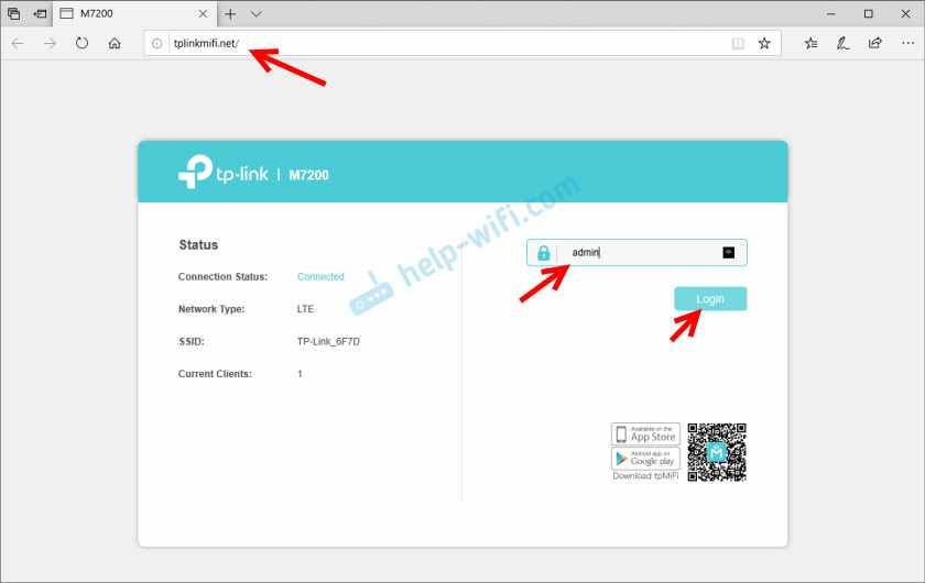 Просто выберите Wi-Fi сеть из писка доступных на своем мобильном устройстве, или компьютере, введите пароль и подключитесь. После подключения с любого устройства, через любой браузер можно зайти в настройки TP-Link M7200. Для этого перейдите по адресу http://tplinkmifi.net. Заводской пароль для входа в настройки – admin.