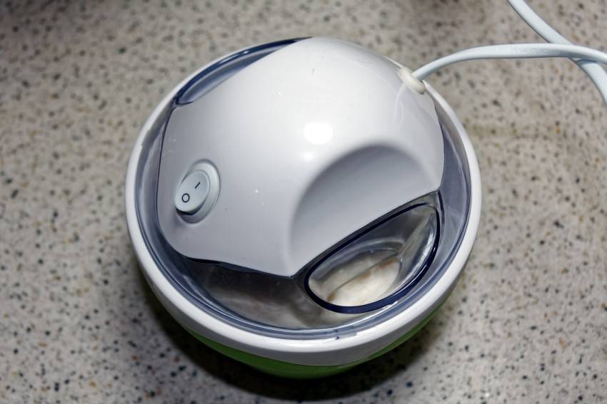 Полуавтоматическая мороженица состоит из чаши, стенки которой заполнены соляным раствором, и миксера. Соляной раствор внутри стенок чаши выполняет роль аккумулятора холода. Перед использованием чашу необходимо поместить в морозильник, чтобы соляной раствор замерз. В инструкции указано, что необходимо держать чашу при -18 ГрЦ 24 часа. Но в бытовых холодильниках такой температуры в морозильнике практически никогда не бывает. Тем не менее, по моему опыту в бытовом холодильнике можно нормально охладить чашу, если держать ее там 60 – 84 часа (2.5 – 3 суток). В охлажденную чашу помещается приготовленная смесь. В инструкции рекомендуется сначала собрать мороженицу (одень на чашу крышку с миксером), включить миксер, потом через отверстие постепенно наливать смесь. Но так наливать густую смесь очень долго и сложно. Я сразу наливаю смесь в чашу, потом закрываю крышку и включаю миксер. Масса не успевает примерзнуть к стенкам, если между помещением ее в чашу и включением миксера походит 2 – 3 минуты.