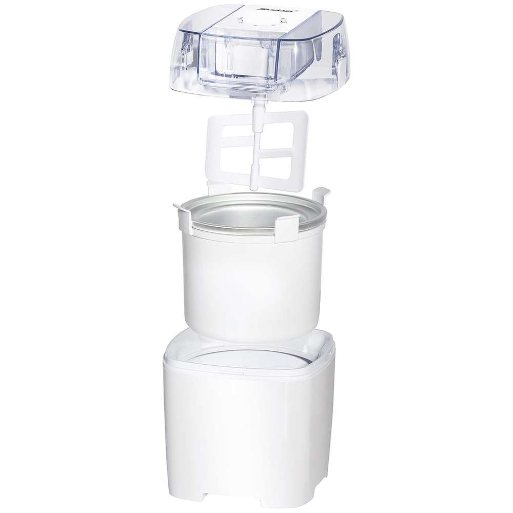 Это первая модель в нашем обзоре, которая оборудована металлической чашей с двойной стенкой, причем между стенками находится соляной раствор, который и будет удерживать холод. Его перед закладкой продуктов необходимо продержать в морозилке порядка 12 часов. Корпус мороженицы изготавливается из глянцевого пластика, на котором будут оставаться разного рода загрязнения, следы пальцев. Сверху он немного закругленный, что также не слишком удобно. При сливе конденсата он выходит из ниши не весь, приходится протирать насухо полотенцем. Предусмотрен переходник, который также изготавливается из пластика. Он представляет собой ручки, они будут надеваться на внутренний железный корпус. Это позволяет защитить руки от обморожения. На верхней крышке изделия располагается двигатель с таймером. При необходимости блок можно вытащить из крышки, если нужно вымыть ее саму. Вместе с мороженицей поставляется шпатель, выполненный из силикона. Им очень удобно перемешивать приготавливаемое блюдо, чтобы придать ему большую равномерность. Вся конструкция собирается и разбирается интуитивно понятно, с этим ни у кого из пользователей сложностей не возникает. Стоит отметить важную особенность – продукты необходимо заливать в чашу, когда она уже установлена в мороженице. Иначе они начнут возле стенок схватываться холодом, и мотору может не хватить мощности для того, чтобы тщательно их размешать.