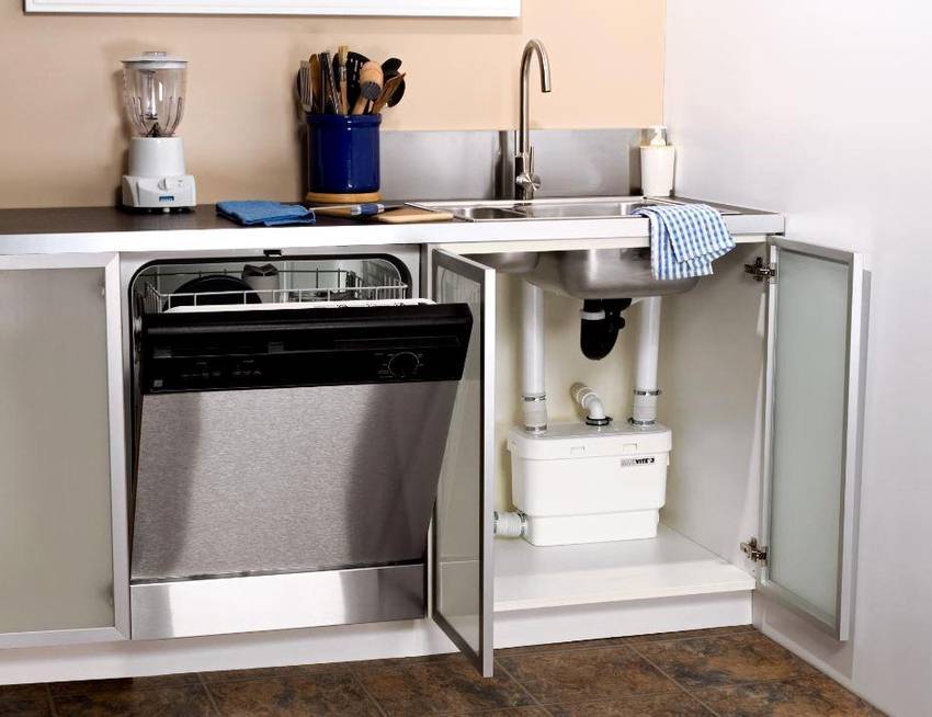 Под раковиной. Некоторым хозяйкам кажется, что самым лучшим решением станет установка устройства для мытья посуды под раковину. Это мнение ошибочное! Габариты посудомоечной машины в большинстве случаев превосходят объем места под раковиной. Это создаёт трудности с размещением коммуникационных элементов устройства.