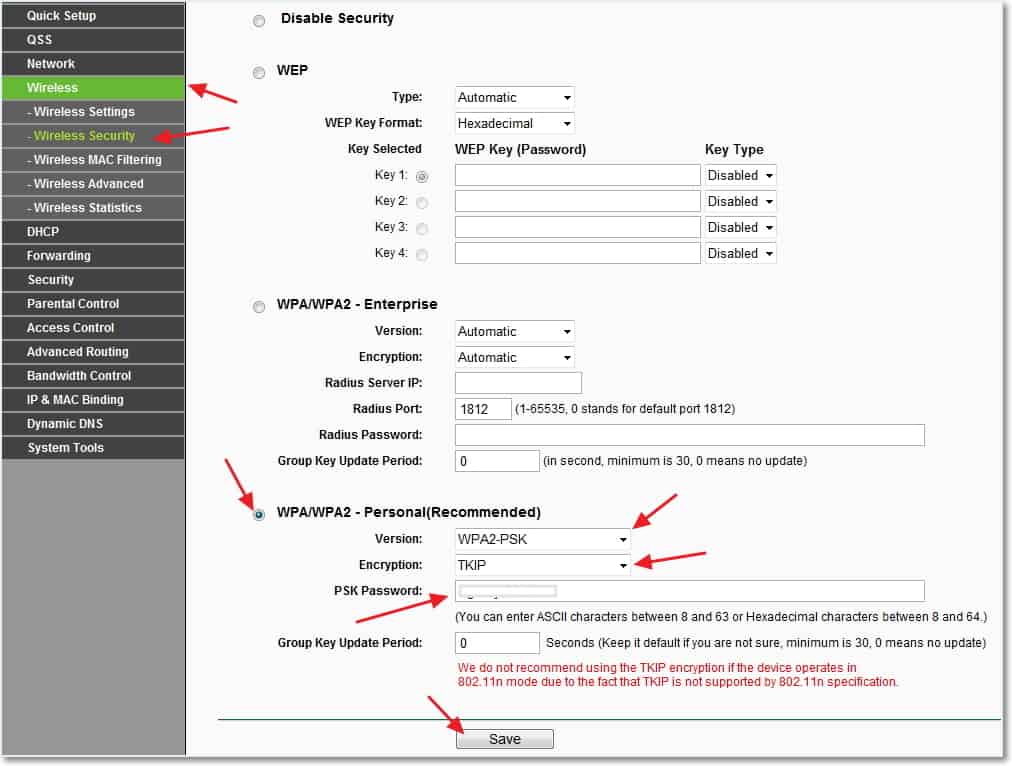 - Сначала попытайтесь изменить способ шифрования, зайдя в настройки безопасности wifi