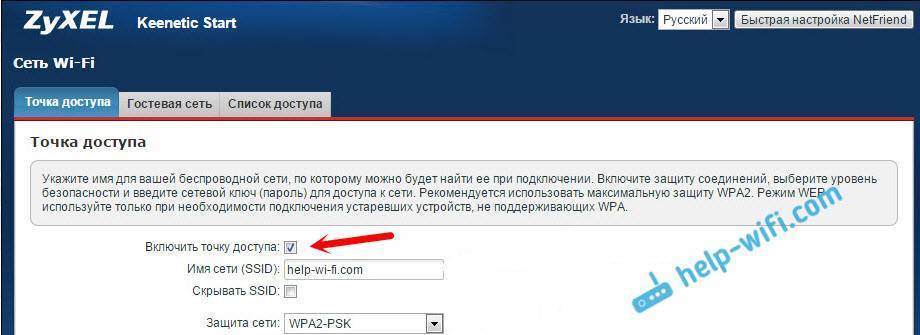 На ZyXEL Keenetic, в разделе “Wi-Fi сеть” должна стоять галочка возле пункта “Включить точку доступа”.