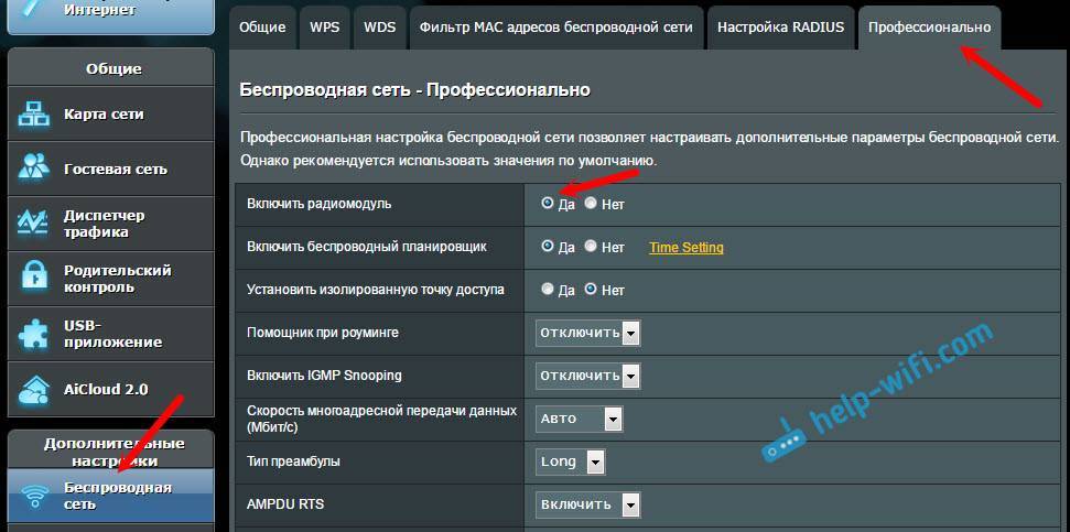 На маршрутизаторах ASUS открываем раздел “Беспроводная сеть”, вкладка “Профессионально”. Напротив пункта “Включить радиомодуль” переключатель должен стоять возле “Да”.