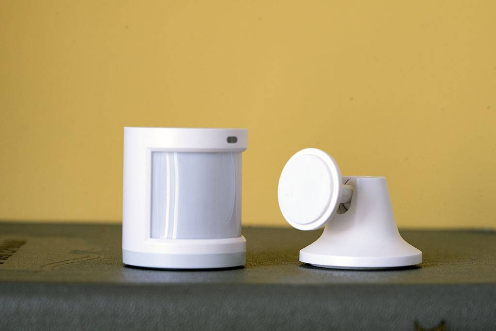 - Датчики движения. Задействуются в широком спектре сценариев – позволяют автоматизировать включение и отключение освещения в комнате, активизация камер наблюдения, включение тревожной сигнализации и т.д. Датчик от Mijia способен обнаруживать движение и отсутствие движения через определённый временной промежуток: от 5 до 30 минут. Устройство от Aqara также имеет ножку-крепление, позволяющую ориентировать детектор в пространстве.