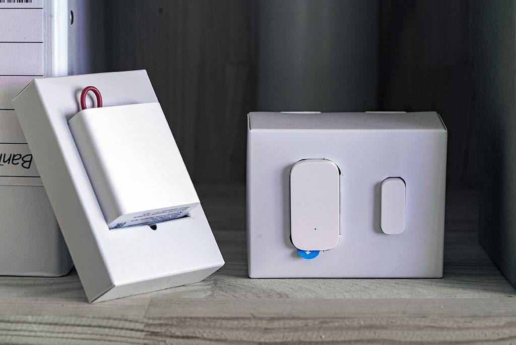 Датчики, что устанавливаются на дверь для обнаружения движения – составные, их два. По габаритам достаточно миниатюрны, как и хаб, также имеют кнопку для синхронизации. Базой для этих датчиков выступил геркон. Если дополнительный модуль — тот, что меньше — отдаляется от основного на 22 мм или больше, то автоматически отправляется сигнал на смартфон. Питание, как и на датчике движения, от батареек.