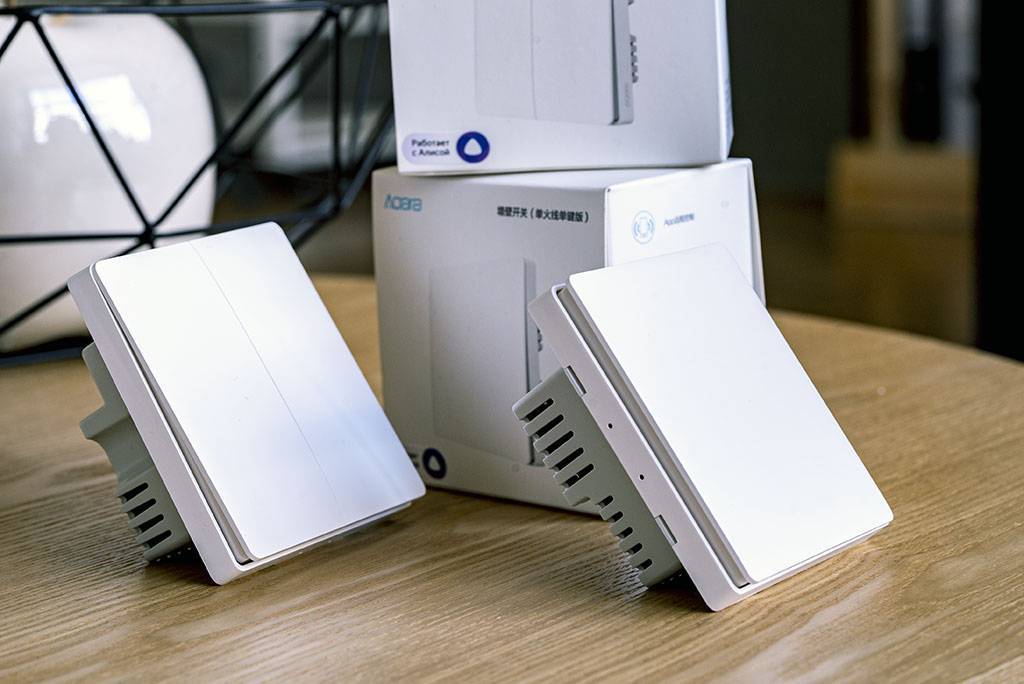 По конструкции умные выключатели бывают с нулевой фазой – вариант для китайской внутридомовой сети. Для России более подходит устройство Aqara с разрывом цепи, так как у нас нет нулевой линии. Они имеют контакт для входящей фазы и один-два – для исходящей. Беспроводные варианты выключателей по своей сути аналогичны беспроводным кнопкам.