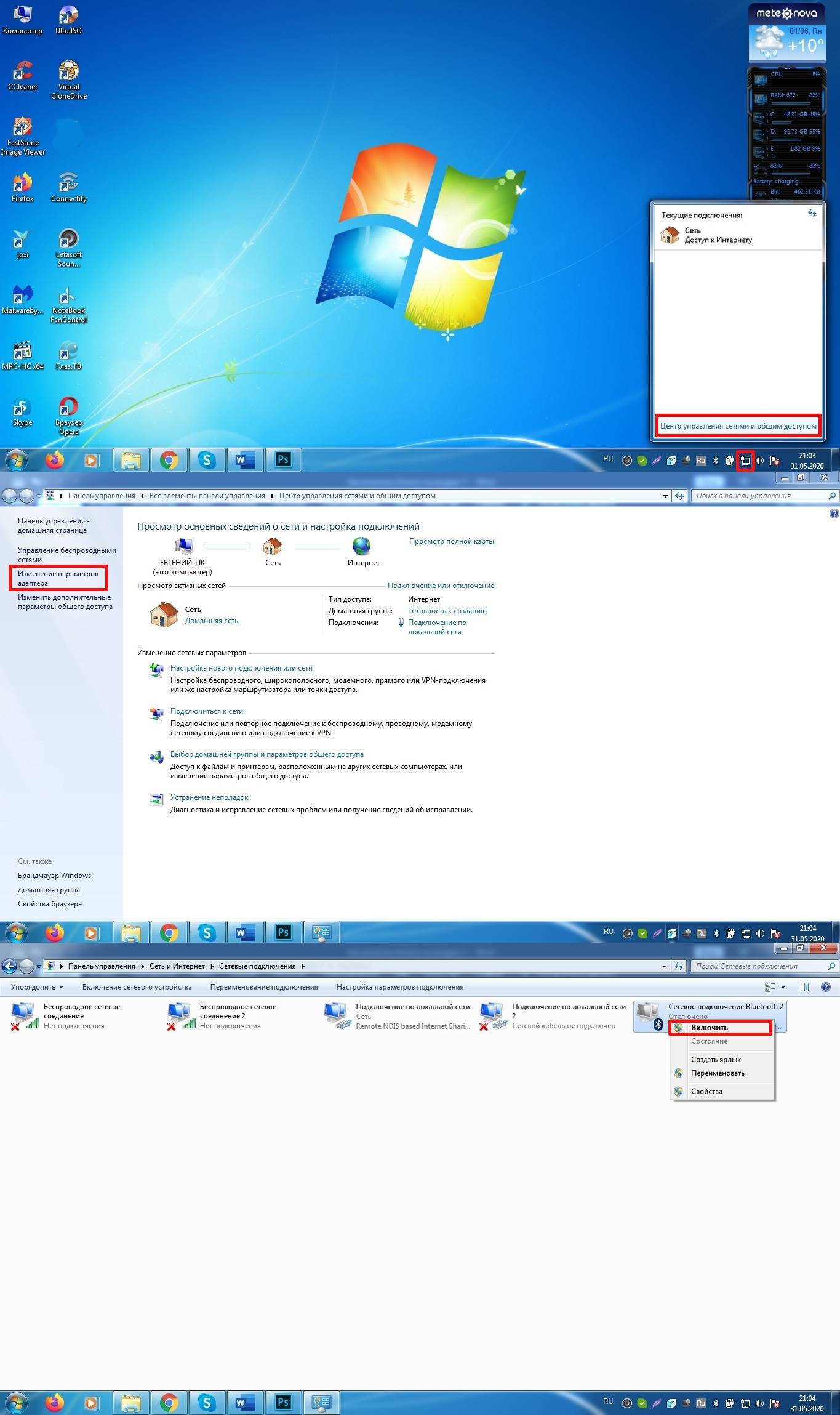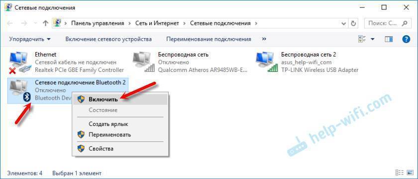 Также можно запустить Bluetooth через иконку «Сеть». Для этого жмут на нее, а потом выбирают в небольшом окне «Центр управления сетями и общим доступом». После чего в правой части экрана нужно выбрать пункт «Изменение параметров адаптера». Далее на дисплее появится список сетевых подключений ПК, где требуется также правой кнопкой мышки нажать на «Сетевое подключение Bluetooth» и выбрать в открывшемся окошке вкладку «Включить».