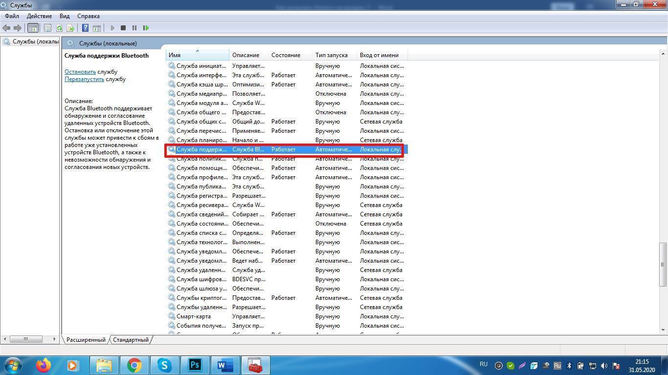 - Далее запустится «Диспетчер служб», в котором находят и нажимают два раза вкладку «Службу поддержки Bluetooth».