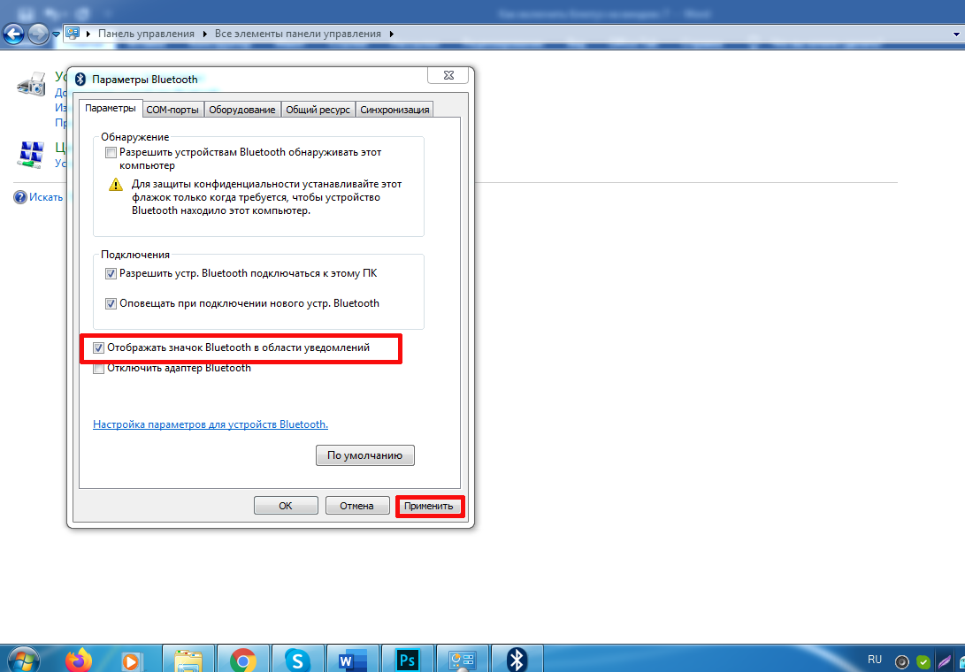 Потом в пункте «Устройства и принтеры» необходимо нажать вкладку «Изменение параметров Bluetooth». В открывшемся окошке установить галочку напротив опции «Отображать значок в области уведомлений» и нажать «Применить». После чего нужно вспомнить, где блютуз в Виндовс 7 размещает ярлычок, чтобы настроить его.